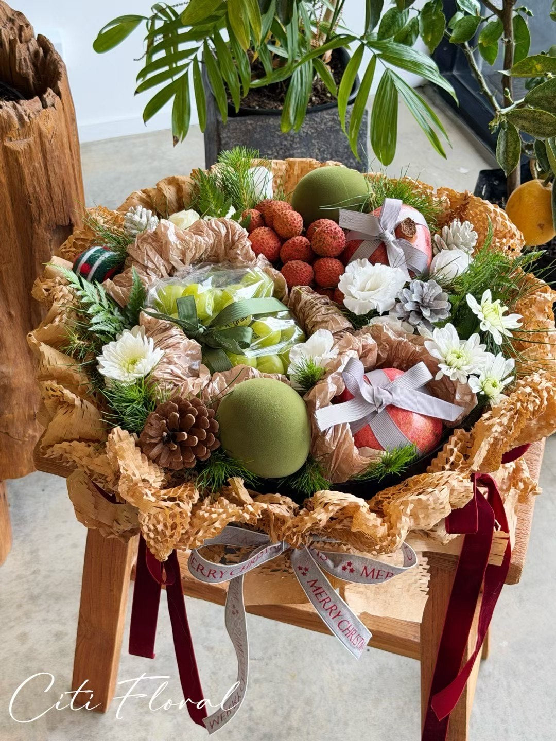 Nestled among wintry evergreen sprigs and wispy fern, this arrangement offers a timeless, snow-kissed aesthetic perfect for any celebration.