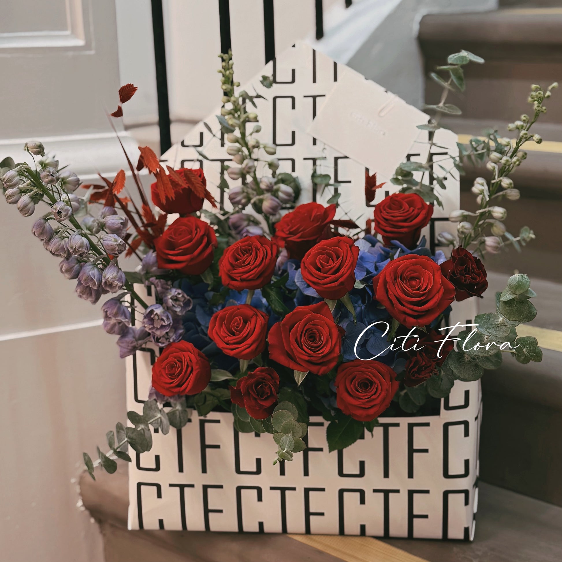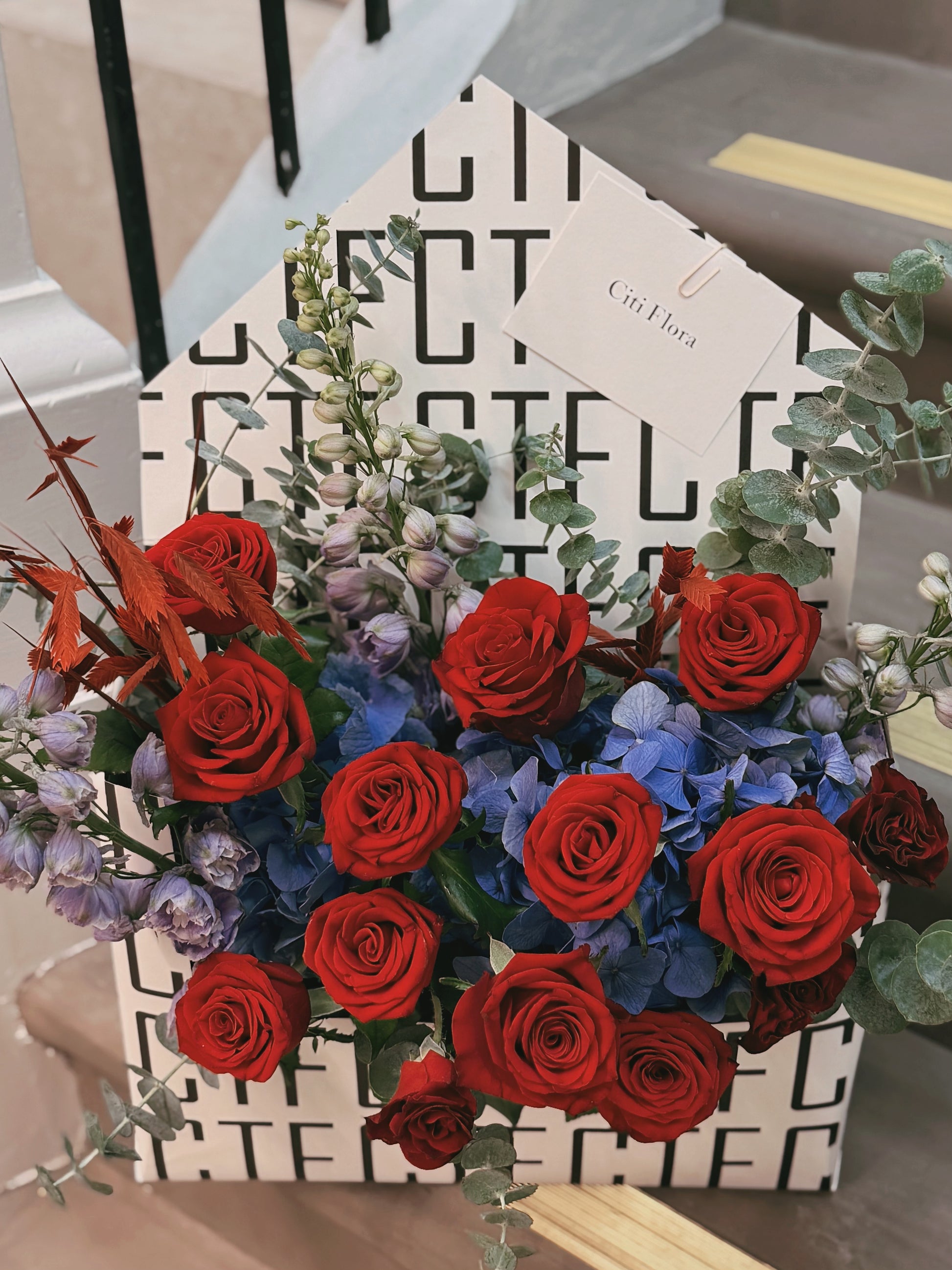 Send a bold statement of modern romance with our signature envelope-style arrangements, featuring rich velvet roses nestled against vibrant textures.