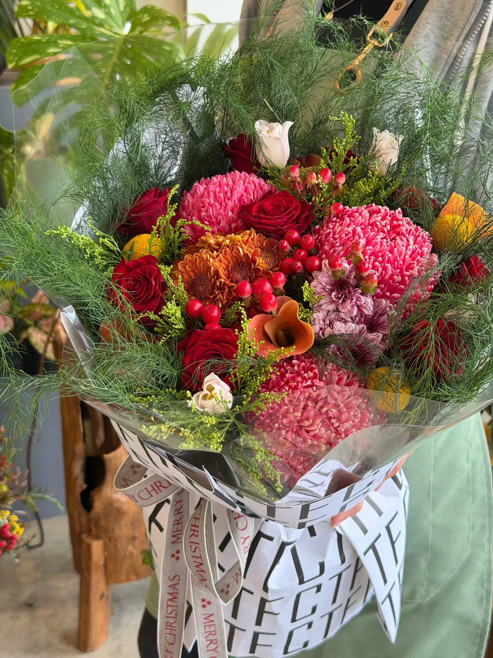 Nestled within a misty frame of lace-like foliage, this festive arrangement offers a sophisticated blend of modern playfulness and timeless romance.